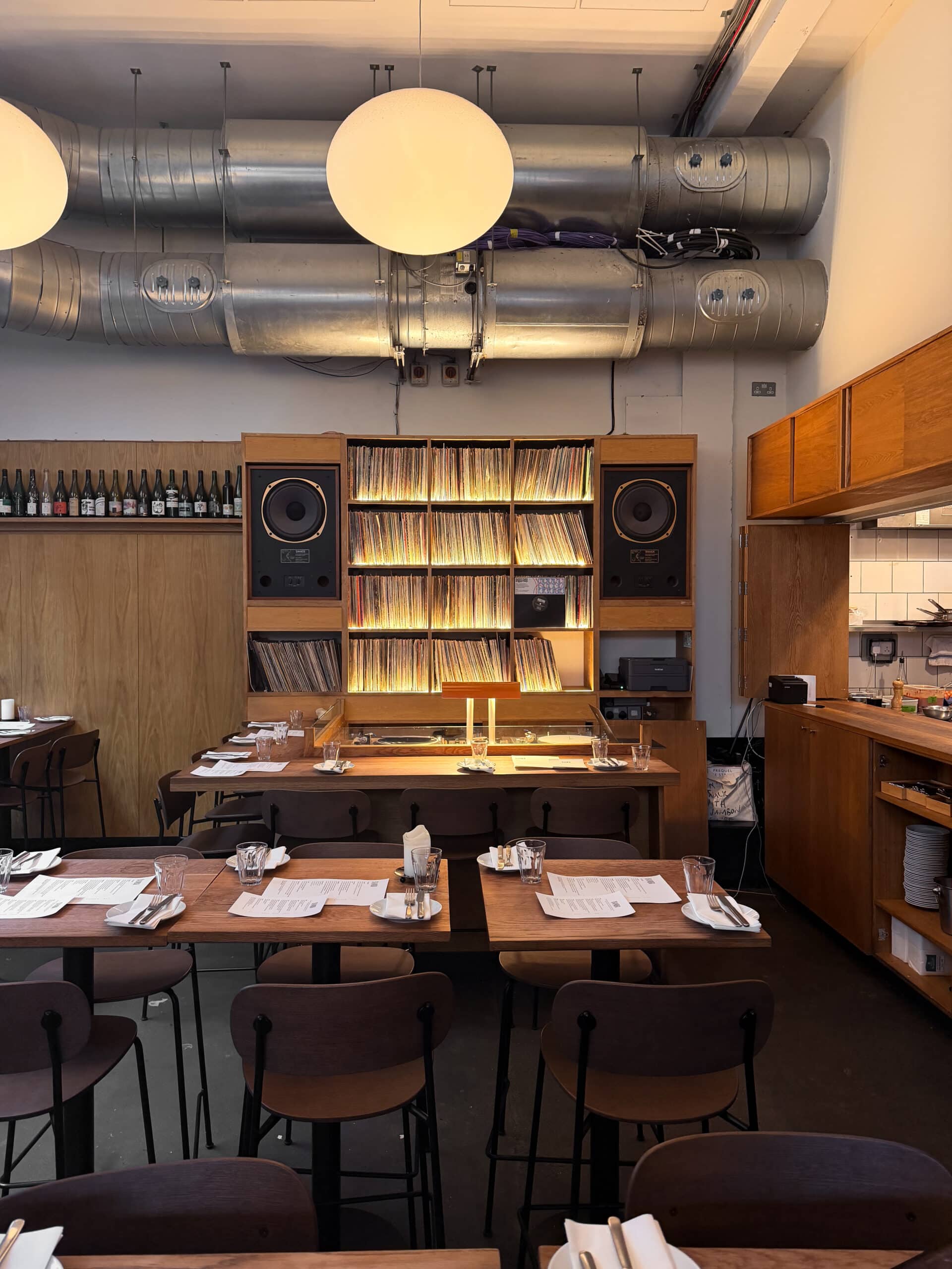 Mekânın atmosferi rahat ama özensiz değil: ahşap masalar, plaklarla çevrili DJ köşesi ve gün ışığını alan geniş bir alan. Akşamları DJ’li programlar ve özel etkinlikler de oluyormuş — bu tarzı sevenler için not düşelim.